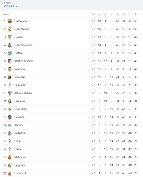 Puan durumu takımlar tarihçe. 2019 2020 sezonu ispanya la liga puan durumu tablosunu bulabilirsiniz. Ispanya la liga son dakika haberleri transfer haberleri ispanya la liga puan durumu fikstür gol krallığı ve diğer tüm istatistikleri ntvspor futbol da.