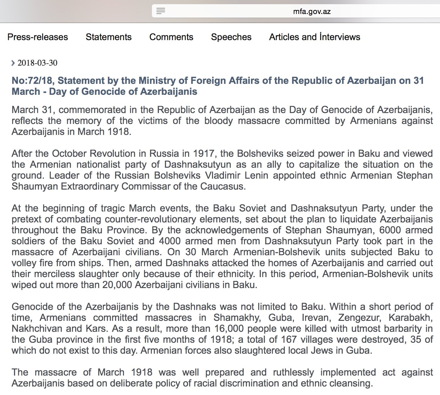 2020 09 21 no 256 20 press release of the press service department of the ministry of foreign affairs of the republic of azerbaijan 2020 09 01 karabakh is azerbaijan stoparmenianaggression 2020 07 28 armenia s aggression will have long lasting consequences for the south caucasus. 99412 596 90 01 e mail. 2019 05 08 no 133 19 statement of the ministry of foreign affairs of the republic of azerbaijan on the 27th anniversary of occupation of the city of shusha 2019 02 22 27th anniversary of the khojaly genocide was commemorated in the city of marneuli of georgia.