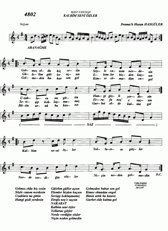 Hasretinle Yandi Gonlum Notalari Sozleri Sarki Notalari Sozleri Akorlari
