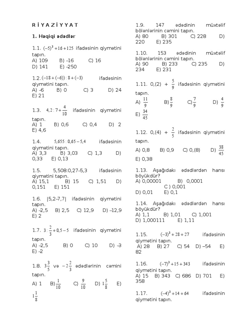 Testleri 1 Ci Sinif Riyaziyyat Misallar