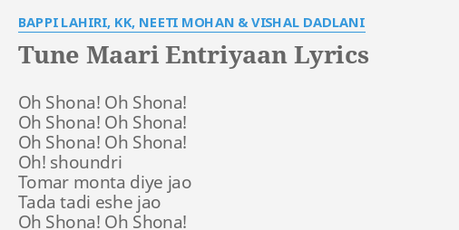 Tune Maari Entriyaan Lyrics By Bappi Lahiri Kk Neeti Mohan Vishal Dadlani Oh Shona Oh Shona